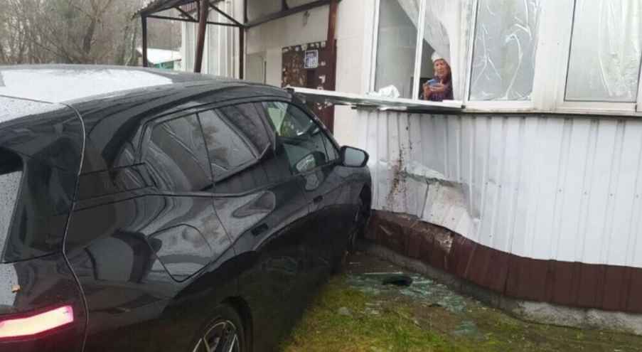 Необычное ДТП произошло днём 25 февраля в Минске - легковушка въехала в здание жилой многоэтажки, покорёжив фасад балкона одной из квартир на первом этаже, а также стойку опоры навеса у подъезда.