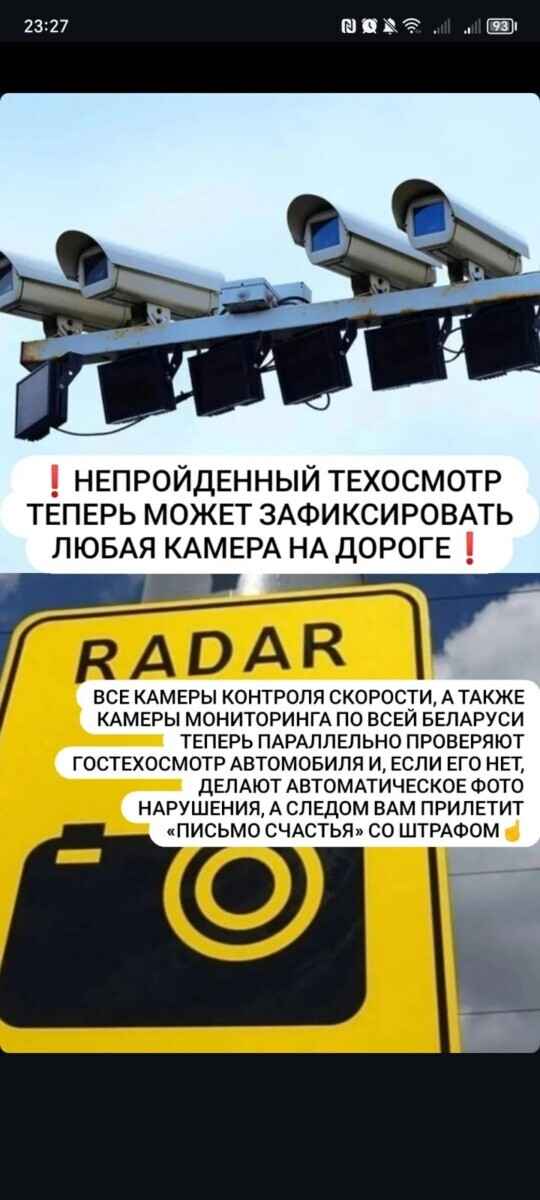 “Все камеры контроля скорости, а также камеры мониторинга по всей Беларуси теперь параллельно проверяют гостехосмотр автомобиля. Если его нет, делают автоматическое фото нарушения, а следом вам прилетит “письмо счастья” со штрафом”, — говорится в заявлении Гродненской ГАИ.