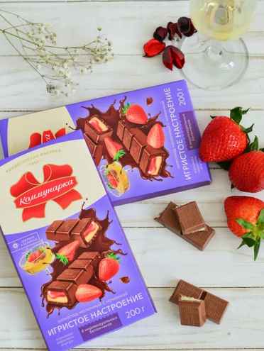 Белорусская фабрика “Коммунарка” презентовала новинку — молочный шоколад с двойной начинкой. Один слой со вкусом клубники, а второй — шампанского.