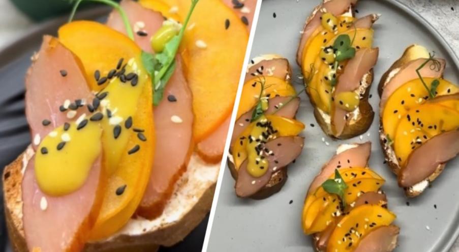 Эта новогодняя брускетта с хурмой потеснит обычные бутерброды. Как приготовить полные тарелки закуски за 10 минут?