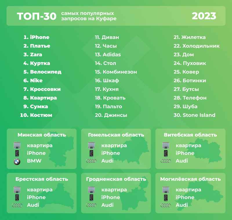 Как видим на инфографике, в 2023 году на площадке объявлений iPhone и Zara также оказались вверху списка популярных запросов. Дальше – Nike , Adidas , кстати, ушедших с белорусского рынка в прошлом году наряду с некоторыми другими… А теперь обращаем взор на 9 строчку: там – белорусский МТЗ !