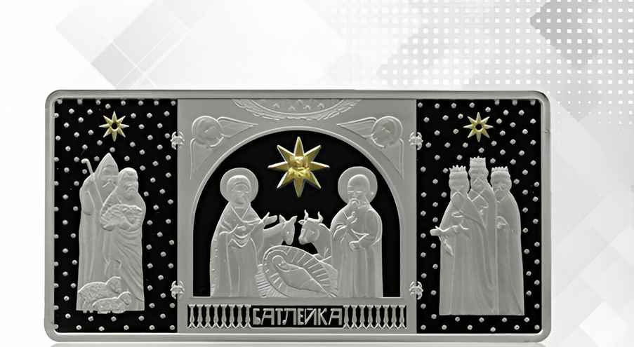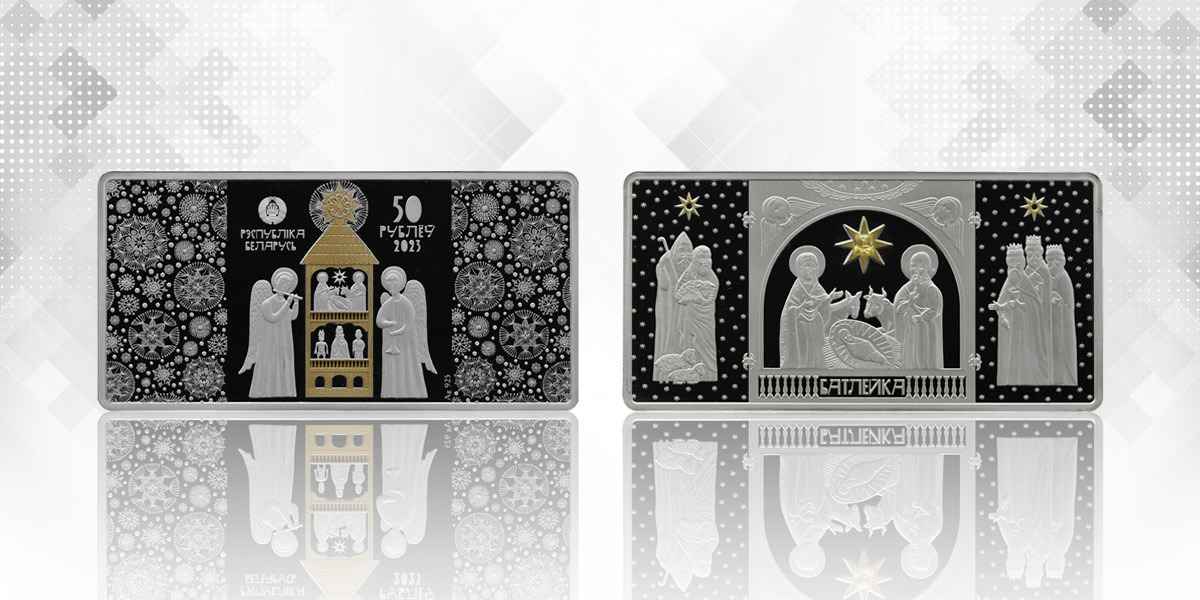 “В центре [монет] размещено изображение двухъярусной батлейки со сценой из спектакля «Царь Ирод», слева и справа от нее – ангелы, играющие на музыкальных инструментах. В левой и правой части монеты расположены поля, заполненные стилизованными снежинками”, - сообщили в Нацбанке.