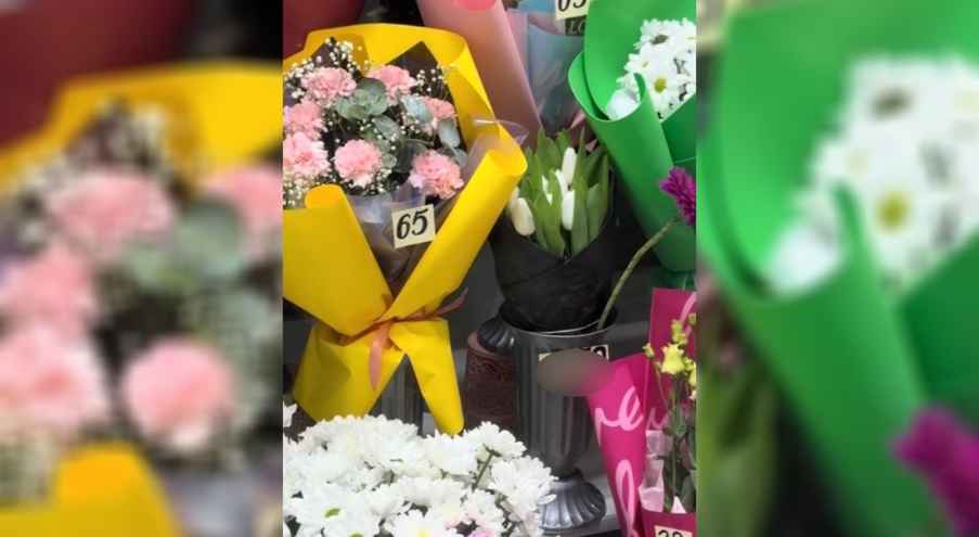 По информации автора ролика, в одной из точек торгового центра “Арбат” в Могилеве за один тюльпан просят 8,5 рубля. Рядом стоял букет гвоздик за 65 рублей, а букет, вероятно, белых роз стоит в этом магазине 63 рубля.