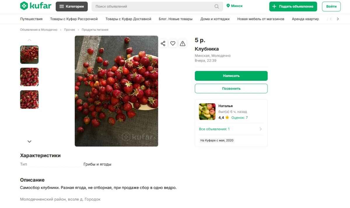 Кстати, на площадках с объявлениями можно найти и более выгодные предложения по самосбору ягод. Так, на фермерских полях в районе деревне Городок того же Молодечненского района предлагают собрать ягоду за 5 рублей за кило.