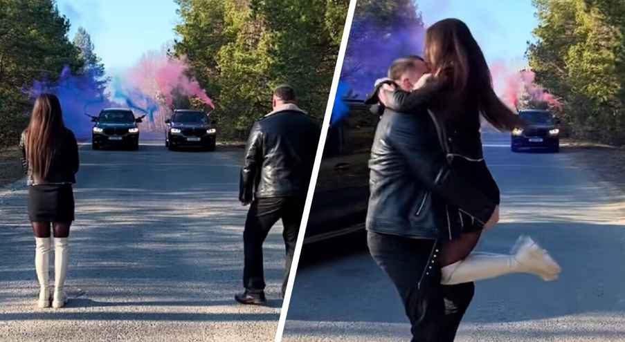 Как видно в ролике, опубликованном пользовательницей @olgakrishko, будущие родители стоят посреди лесной дороги лицом к двум приближающимся BMW. Из специальных шашек каждого авто валит цветной дым: у одного — синий, у другого — розовый. По замыслу, цвет дыма от машины, которая рванёт к родителям, и должен раскрыть главную интригу.