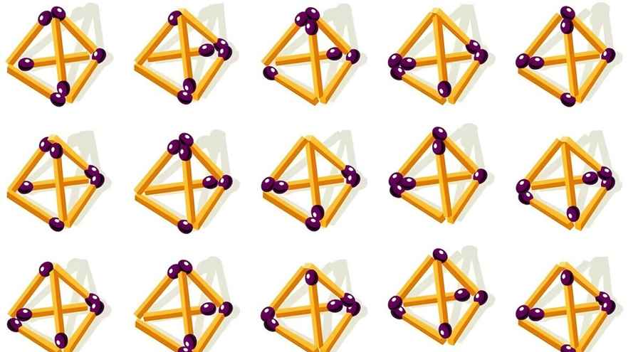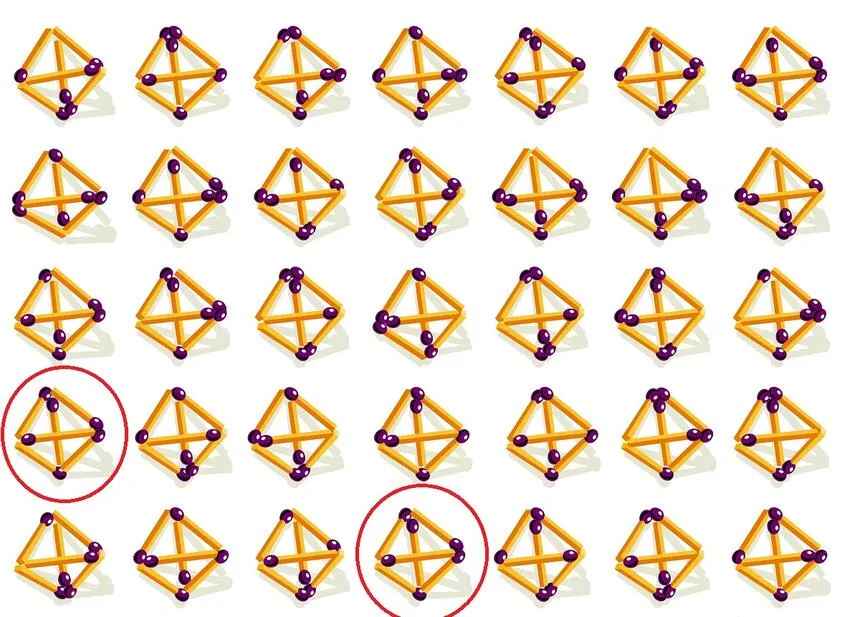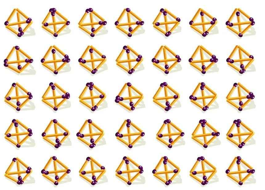 Перед вами визуальный тест на IQ, который проверит вашу внимательность и пространственное мышление. На картинке ниже изображены 35 почти идентичных пирамидок из спичек, но лишь две из них полностью совпадают. Сможете их обнаружить?