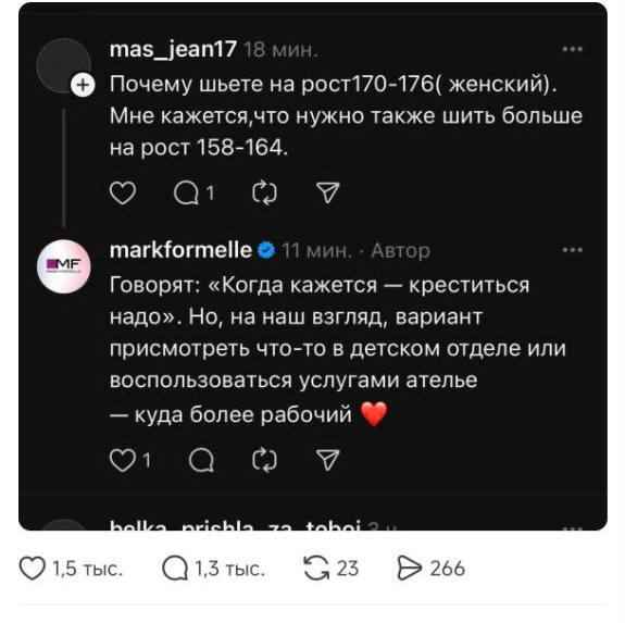 На что официальный аккаунт Mark Formelle ответил: “Когда кажется - креститься надо”. Но, на наш взгляд, вариант посмотреть что-то в детском отделе или воспользоваться услугами ателье — куда более рабочий”.
