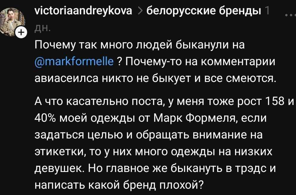 Белорусский производитель одежды Mark Formelle попал в скандал после того, как его сотрудники ответили на пост клиентки в социальной сети Threads. Это вызвало негодование и бурю эмоций у пользователей. Хотя были и те, кто встал на защиту бренда. Спустя несколько дней, 31 июля, компания принесла извинения.
