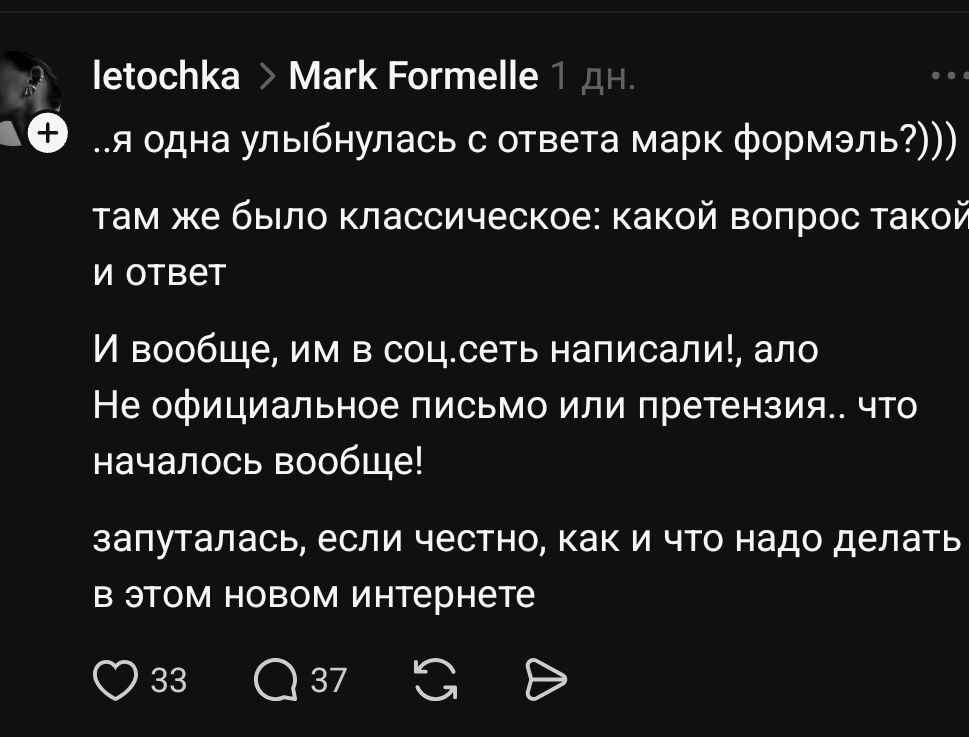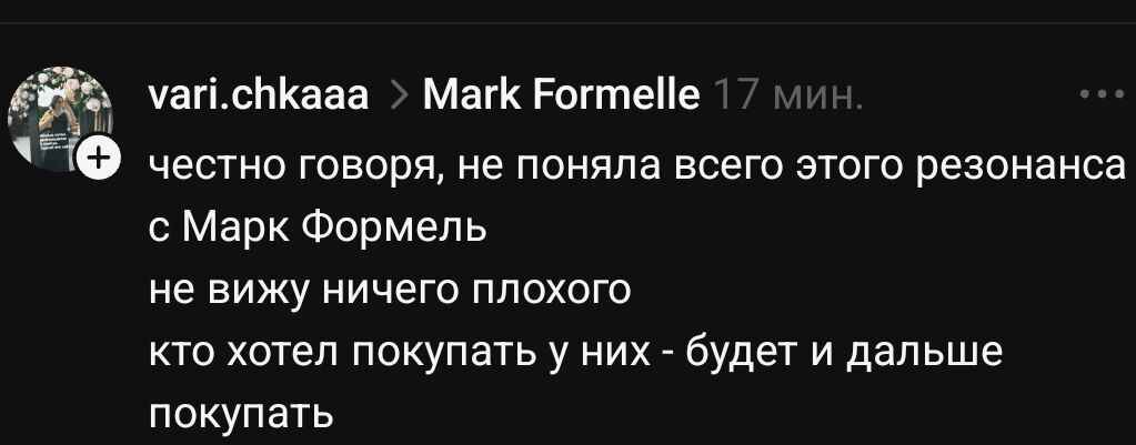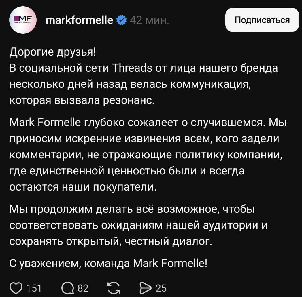 “Mark Formelle глубоко сожалеет о случившемся. Мы приносим искренние извинения всем, кого задели комментарии, не отражающие политику компании, где единственной ценностью были и всегда остаются наши покупатели”, — заявили представители в Threads.