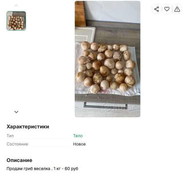 Кстати, уже не первый грибной сезон на весёлку высок спрос среди покупателей. Предложения о продаже этого гриба можно найти на популярных платформах для частных объявлений. Там цена на гриб стартует от 3 рублей за штуку . Есть и оптовые предложения - 60 рублей за кило.