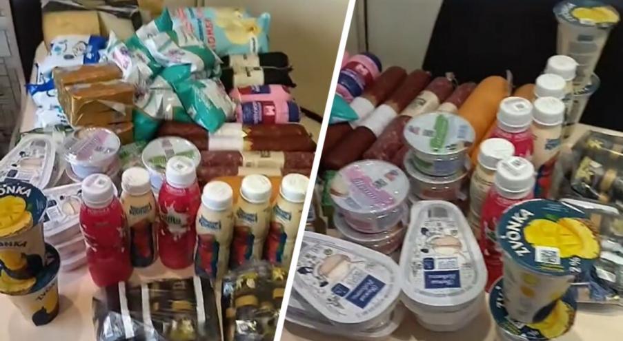 На видео - полный стол товаров, причем не только “молочка”. Здесь и питьевые йогурты, и обычные, и глазированные сырки, и сливочное масло, и колбасы, и сыр (как твердый, так и плавленый), и мороженое, и сметана.