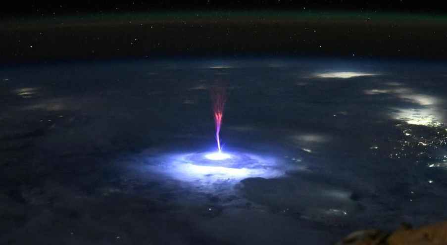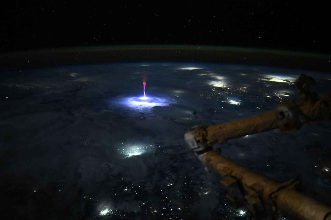 Редкий снимок удалось сделать на днях с Международной космической станции (МКС). В объектив камеры попал гигантский синий джет - особый вид кратковременных световых явлений (КСЯ). Их также называют “молнией наоборот” - электрический разряд, возникающий в атмосфере над грозовым облаком не опускается вниз, а поднимается вверх, доходя до нижних слоёв ионосферы (на высоте 80–90 км над поверхностью Земли).