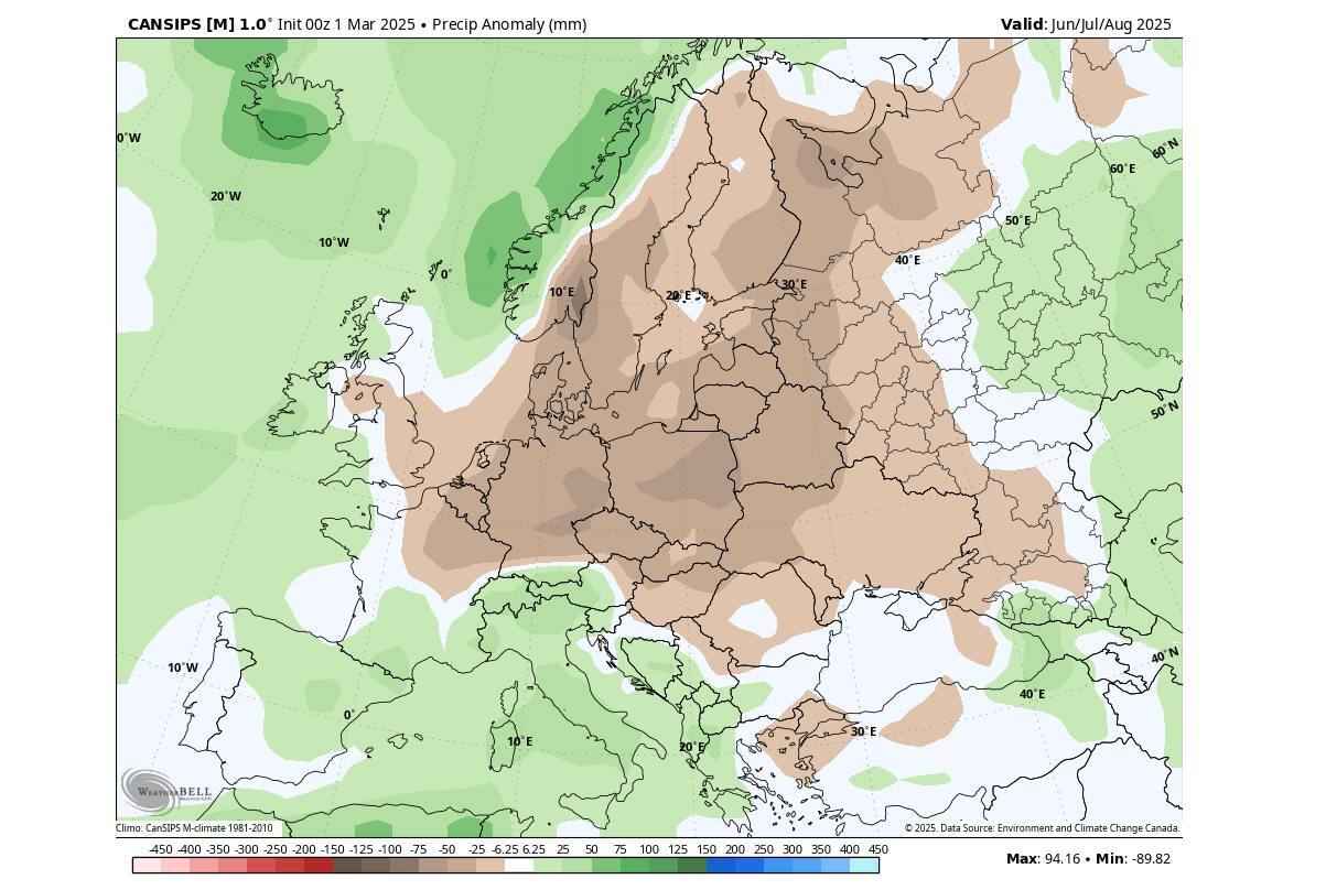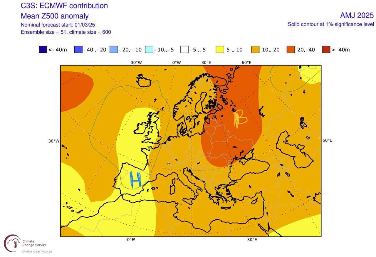 Анализ аномалий атмосферного давления показал преобладание области низкого давления («Н» на карте) над западной и северо-западной Европой и области высокого давления («В») над востоком и северо-востоком. Это может привести к преобладанию южных ветров над западной и центральной Европой, несущих влагу из Средиземноморья.