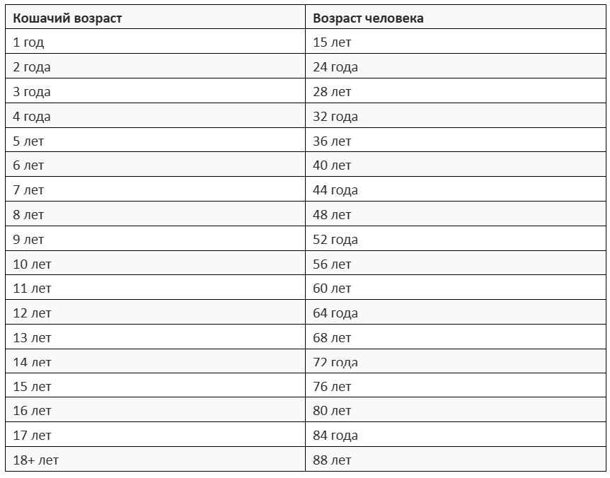 Специалисты популярного производителя кормов для домашних животных Purina объясняют, что «в зависимости от возраста, продолжительность жизни кошек меньше, чем у нас, поэтому их годы эквивалентны многим человеческим годам».