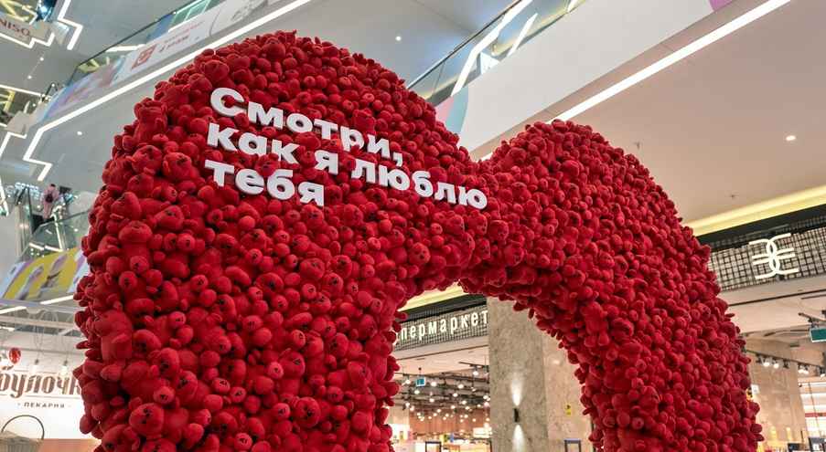 Белорусский “Альфа Банк” в преддверии Дня всех влюблённых, который традиционно отмечают в некоторых западных странах 14 февраля, установил в одном из столичных торговых центров огромное красное сердце из 1000 плюшевых медведей.