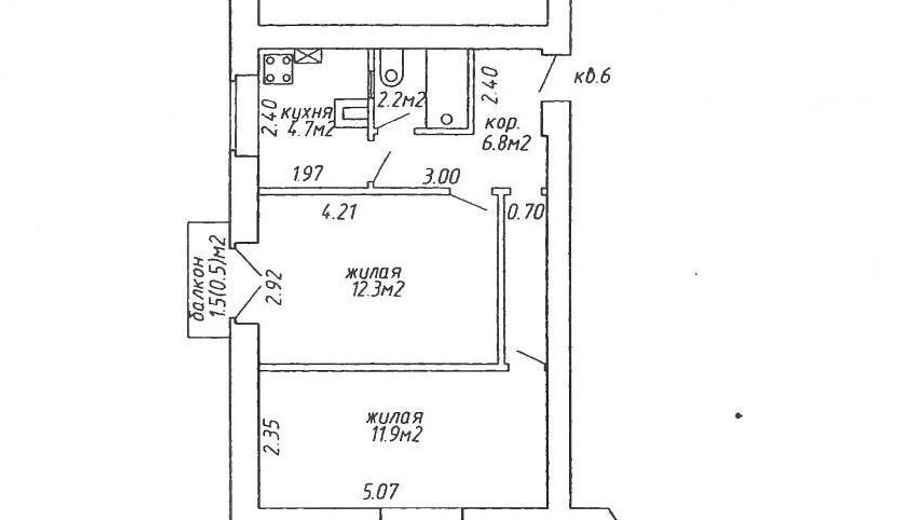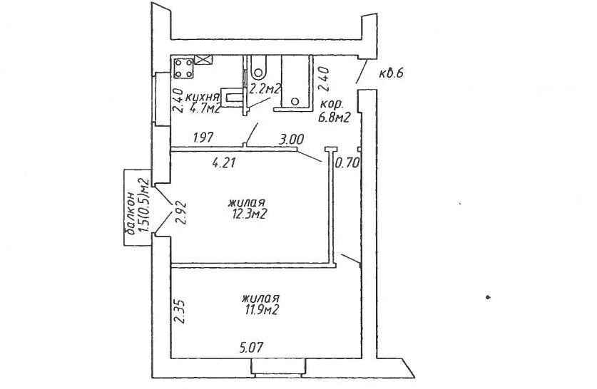 Общая площадь — 37,9 кв.м. Первоначальная планировка была не очень удобной: совмещённый санузел (2,2 кв.м.) с сидячей ванной, мини-кухня, комната с балконом, тёмный коридор от прихожей, в конце которого располагалась спальня-пенал (ширина 2,35 м), отметил Интернет-портал Realt. Судя по свежим штробам, проложена новая проводка. Полы же остались старые деревянные.