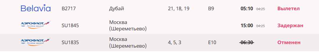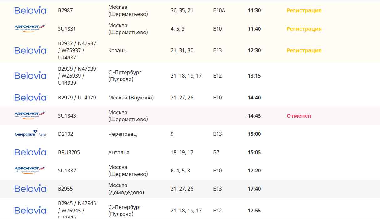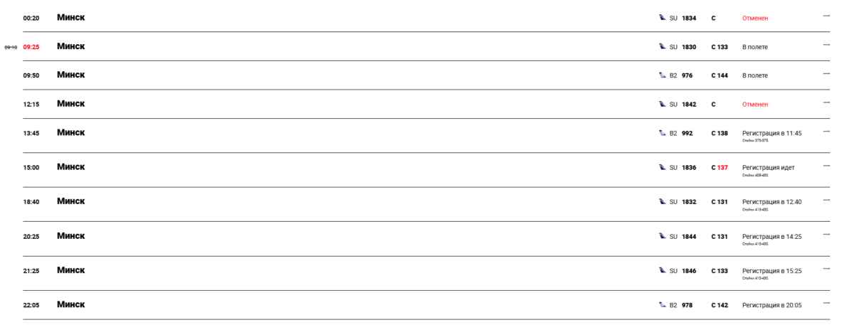 По данным табло аэропортов, отменили следующие рейсы из Шереметьево в минский аэропорт: