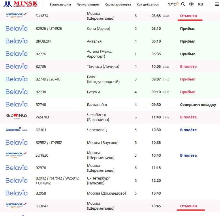 Соответственно, отменили и вылеты из Минска: SU1835 отправлением в 06:30 и SU1843 отправлением в 14:45.
