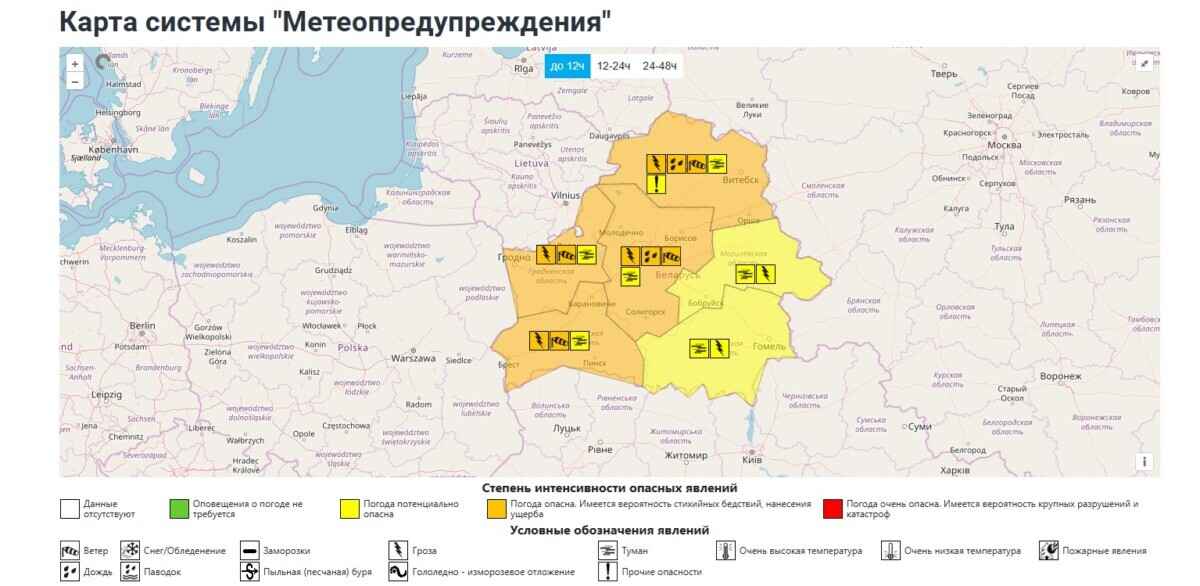 Согласно утреннему прогнозу Белгидромета, грозы будут преследовать белорусов сегодня в течение всего дня и прогремят во всех уголках Беларуси. При грозах местами ожидаются сильные ливни и шквалистое усиление ветра, из-за чего в четырёх областях страны - на Минщине, Витебщине, Гродненщине и Брестчине - объявили оранжевый уровень опасности . Гомельская и Могилёвская области, согласно оперативному прогнозу, до конца дня останутся в жёлтой зоне опасности.