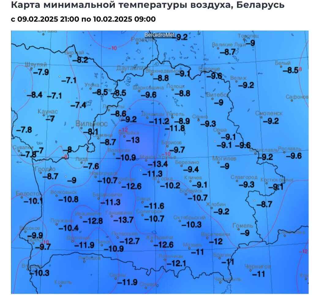 Тем временем минувшей ночью, с 9 на 10 февраля, в Республике также было весьма прохладно. По данным Белгидромета, минимальную температуру воздуха приборы зафиксировали в столичном микрорайоне Уручье — -13,4°С. Однако, по информации синоптиков Nadvorie, в аэропорту “Минск-2” и вовсе наблюдали все -16°С.