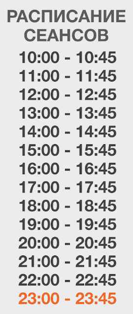 45-минутные сеансы должны начинаться с 10:00, завершатся в 23:45.