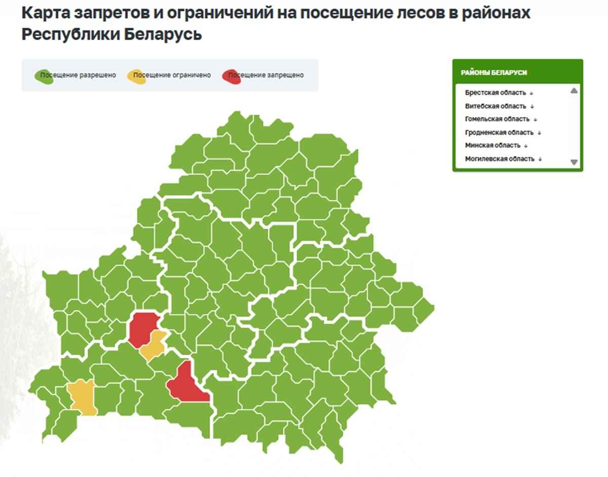 За актуальной информацией о действующих на территории того или иного района Беларуси ограничениях и запретах можно следить по интерактивной карте Минлесхоза по ссылке .