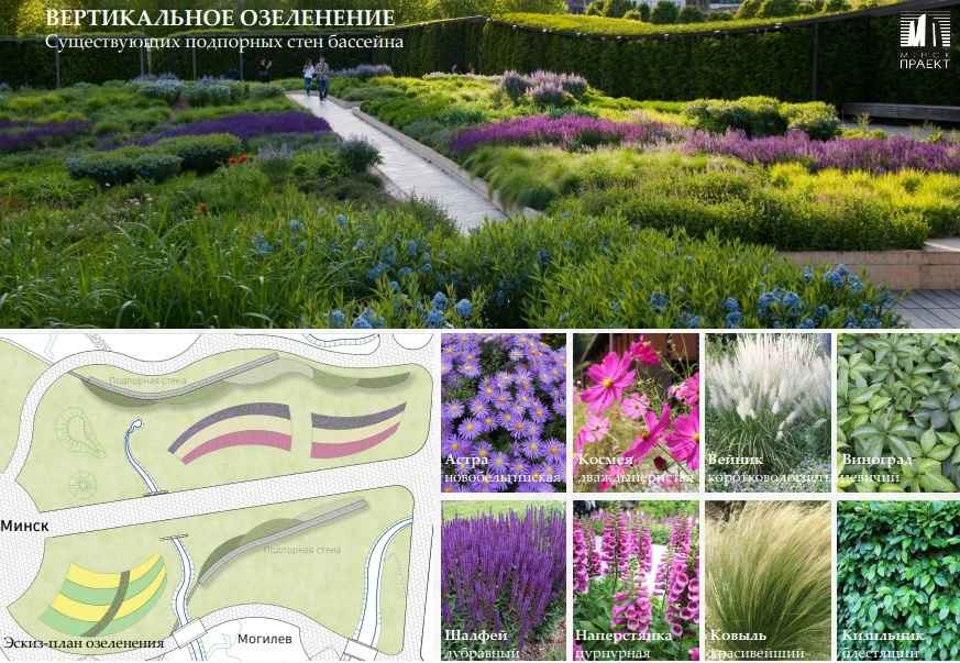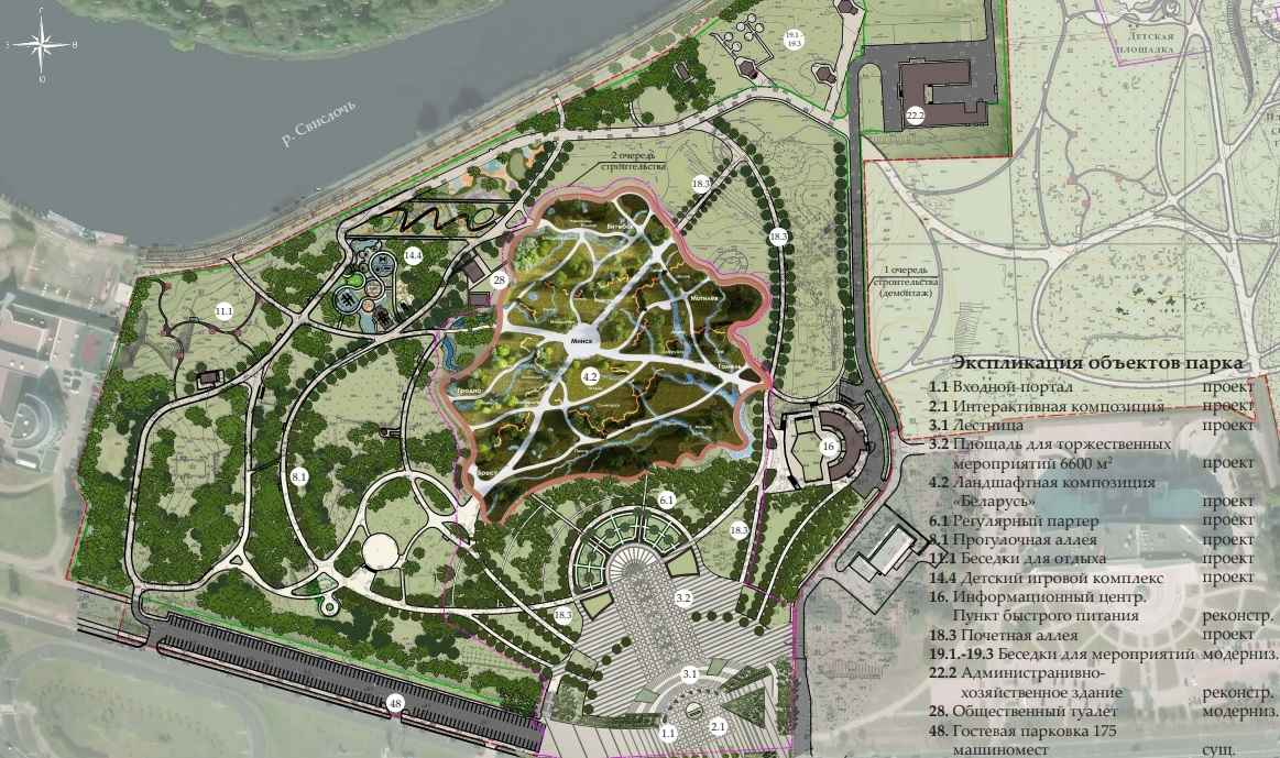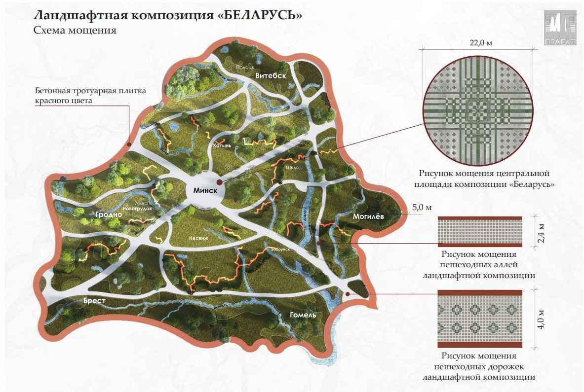Центральное место нового парка пообещали отдать под ландшафтную композицию “Беларусь” площадью 2,4 га. Очертания в плане центральной части повторят контур карты страны, а внутри будут созданы русла рек, контуры озер и зеленые массивы заповедных мест. Русла рек предложили выполнить в виде сухих ручьев с применением георешетки и засыпкой гравием, посадкой вдоль берегов декоративной растительности в виде камыша, луговых трав и цветов.