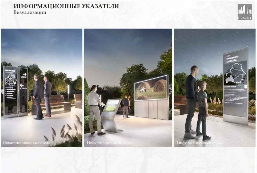 На условных местах размещения каждого областного центра и города Минска в композиции “Беларусь” предложили установить электронные инфообъекты, где посетители смогут прослушать и прочитать информацию об истории, достижениях и перспективах развития городов и страны в целом.