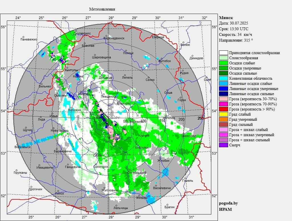 По данным телеграм-канала о погоде в Беларуси “Метеовайб”, днём 30 июля центр страны “накрыли дожди и к сожалению они совсем не кратковременные”.