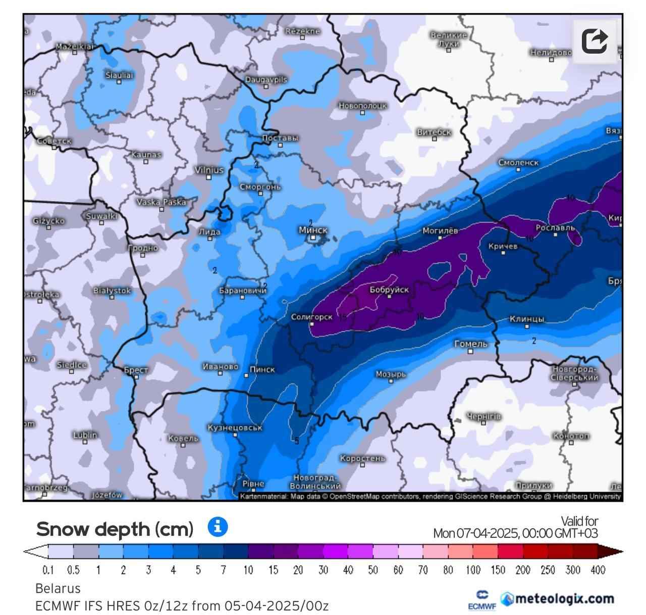 ## Где ждать самых сильных снегопадов? Так, специалисты Telegram-канала "Метеовайб" предупредили , что в воскресенье, 6 апреля, Беларусь окажется в его части активного циклона Зион, под влиянием активного фронта окклюзии. Из-за поступления арктических воздушных масс по юго-востоку страны даже дневная температура будет опускаться ниже нуля.“Ночью на большей части территории, за исключением Витебской области, днём в основном по юго-восточной половине снег, метель, временами сильный снег. К концу понедельника высота снежного покрова согласно модели ЕСМWF и GFS на границе Минской, Могилевской и Гомельской областей может достичь и даже превысить 20 см”, - дали свой неблагоприятный и совсем не весенний прогноз специалисты.