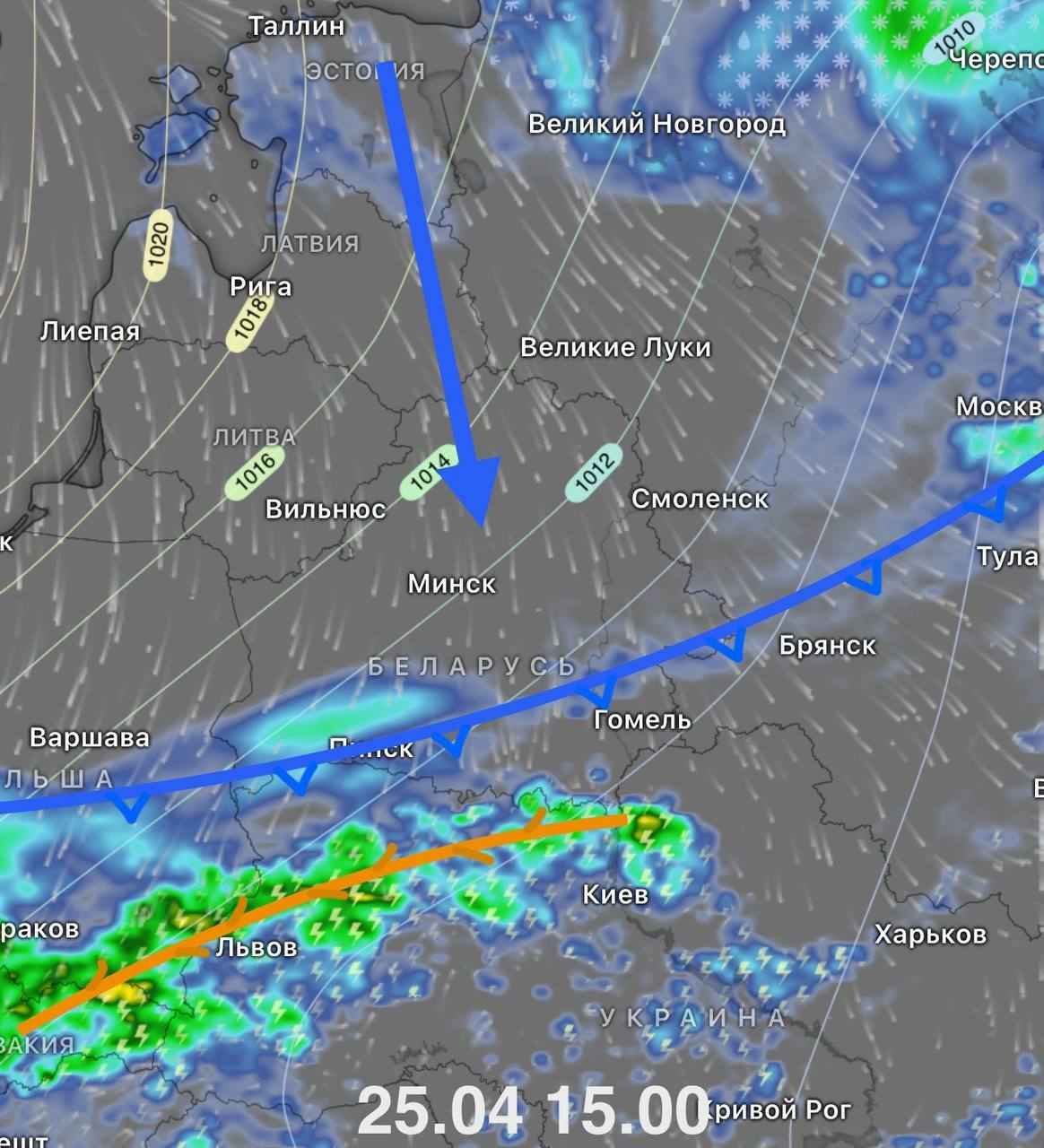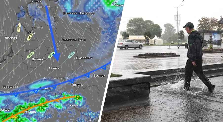 Как объяснили авторы погодных каналов «Метеовайб» и @nadvorie, сегодня-завтра (24-25 апреля) за непогоду будут отвечать атмосферные фронты. Холодный фронт с волнами принесёт ливни и грозы на юг страны, а фронт окклюзии будет поливать дождями север. Там сейчас «пасмурно и дождики». В центре Беларуси при этом сегодня может быть ещё относительно тепло и без осадков.