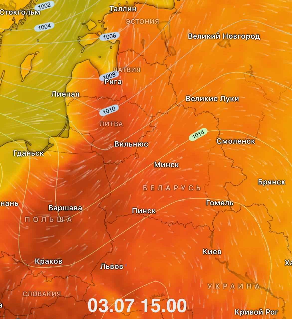 Перелом в погоде может наступить в пятницу, 4 июля . По прогнозам, страну начнёт пересекать холодный атмосферный фронт, который принесёт резкое похолодание. По оценке проекта @nadvorie, температура рухнет сразу на 10-12 градусов — после дневных +35°С белорусов ждут куда более скромные +19..+25°С (по юго-востоку до +27°С), как и пообещал Белгидромет.