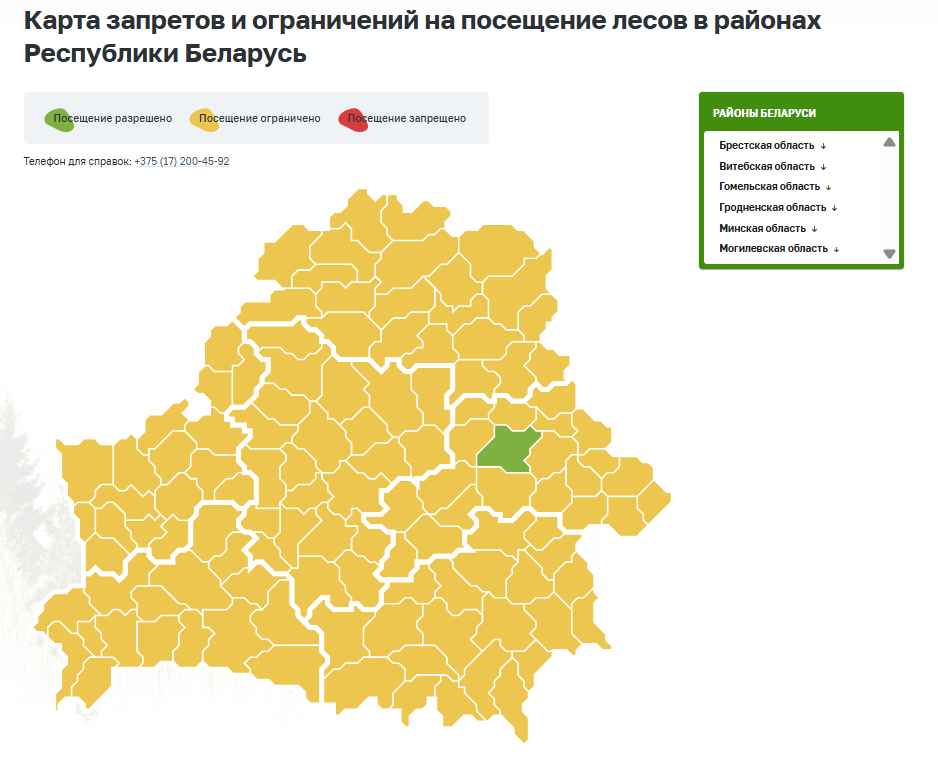 В Министерстве лесного хозяйство Беларуси (Минлесхоз) сообщили, что райисполкомы ввели ограничения на посещение лесов в 117 районах Беларуси. По данным на 6 июля, на интерактивной карте зеленым отмечен лишь один район в одной из областей.