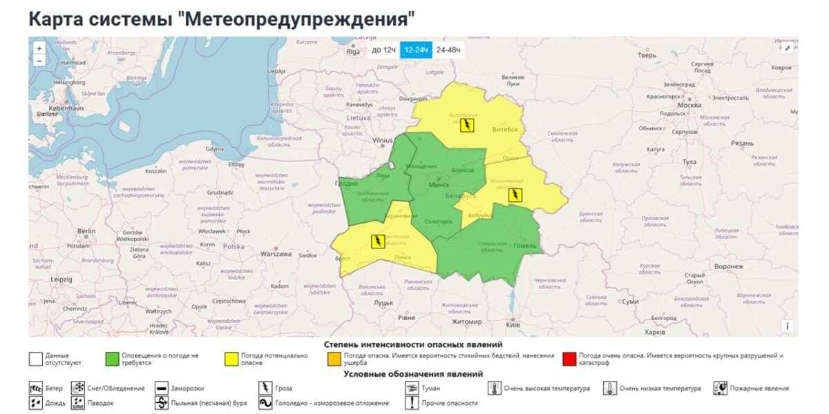 На субботу, 12 июля, Белгидромет выписал “жёлтое” предупреждение для Брестской, Витебской и Могилёвской областей. По их данным, грозы завтра прогремят лишь местами - в западных и крайних северо-восточных районах Беларуси.