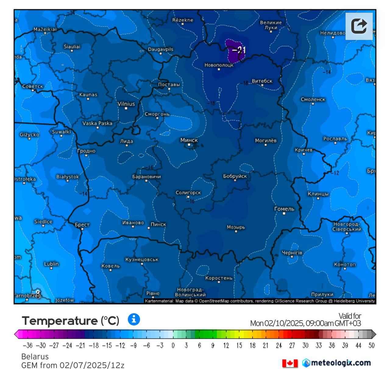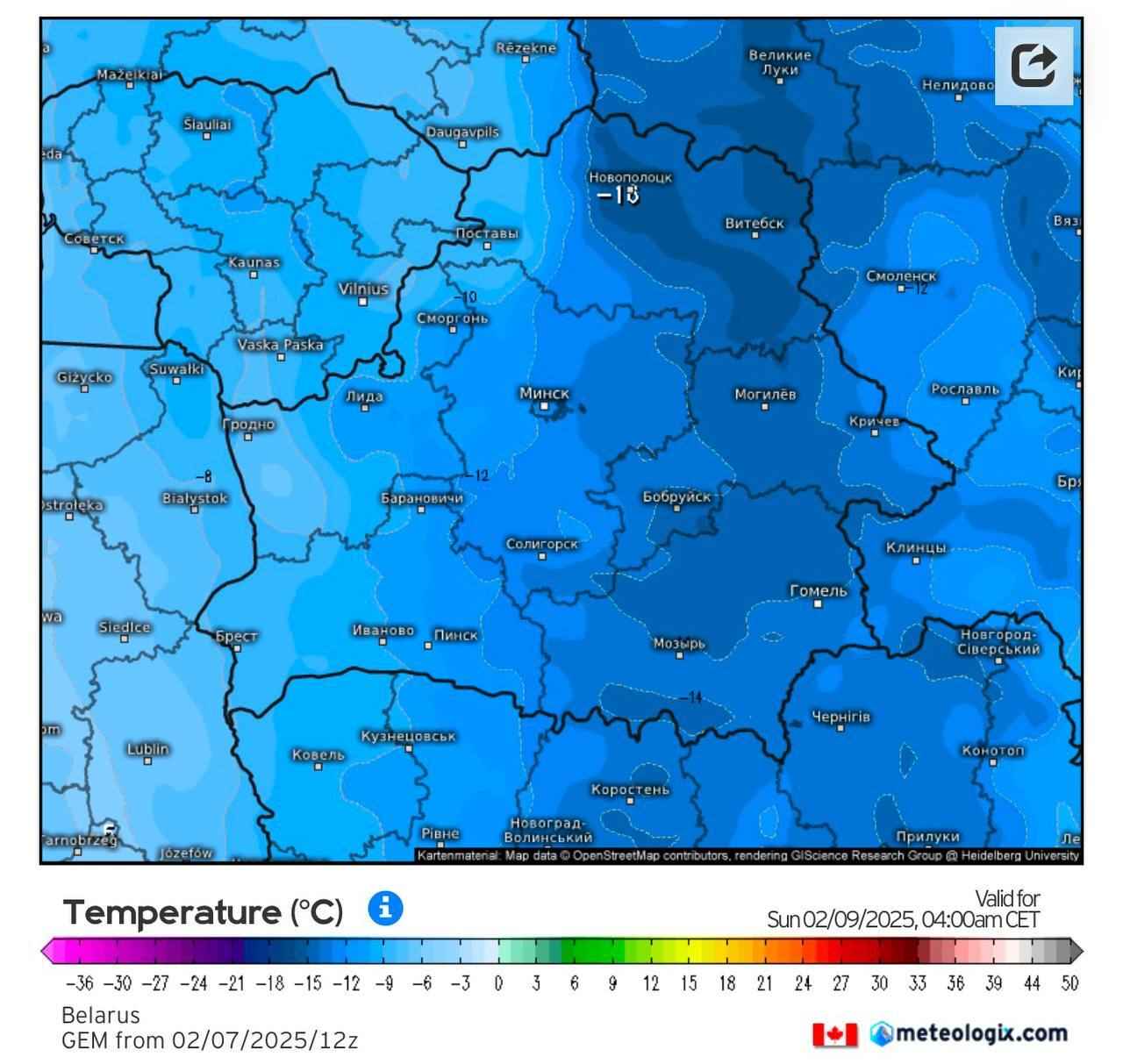 Так, их коллеги из Telegram-канала “Метеовайб”, изучив прогноз канадской модели GEM, рассмотрели в прогнозе на воскресенье и понедельник “совсем сибирские цифры” - до -18°..-21°С. Впрочем, такие цифры специалисты назвали “маловероятными”, а вот понижение ночных температур до -14..-15°С - более чем реалистичным прогнозом.