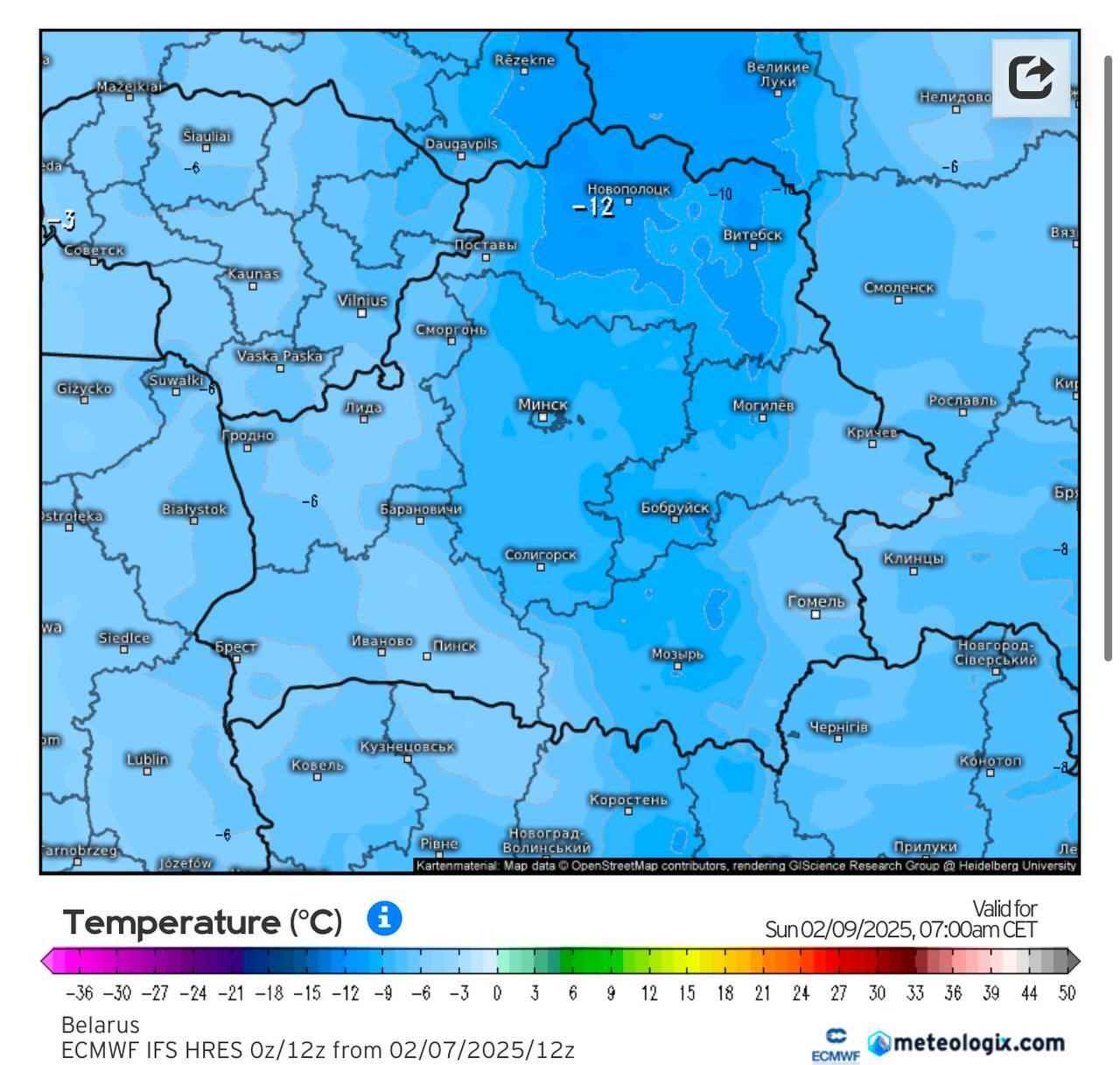 Ранее Telegraf.news рассказал, что синоптики предупредили белорусов о приближении к нашему региону “мощнейшего блокирующего антициклона”, который получил название “Эльвира”. Благодаря ему на протяжении как минимум недели на территории страны совсем не ожидается осадков и должна установиться солнечная, но по-февральски морозная погода.