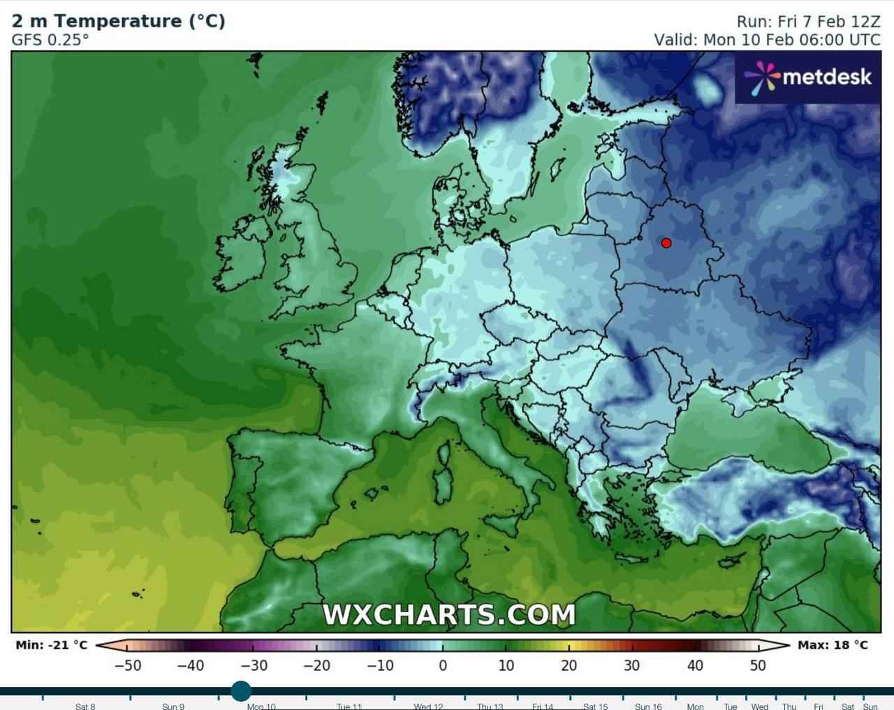 Самая холодная ночь, по расчётам специалистов, ожидается с воскресенья на понедельник, 10 февраля: модель GFS показала морозы в -4..-8°С, европейская ECMWF спрогнозировала уже десятиградусные морозы, до -12°С, а канадская GEM и вовсе посулила все -14..-18°С, “а кое-где даже и ниже”.