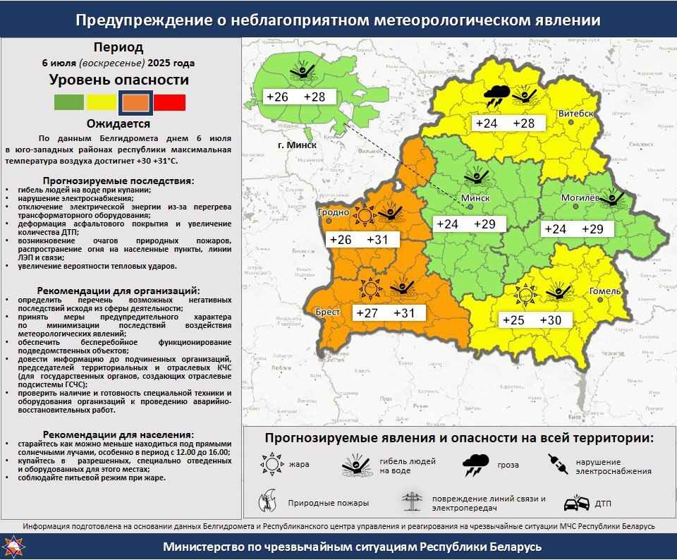 Согласно оперативному предупреждению Белгидромета о неблагоприятном гидрометеорологическом явлении, в воскресенье, 6 июля, на юго-западе страны столбики термометра могут показать +30.. +31°С, из-за чего в Брестской и Гродненской областях объявили оранжевый уровень опасности.