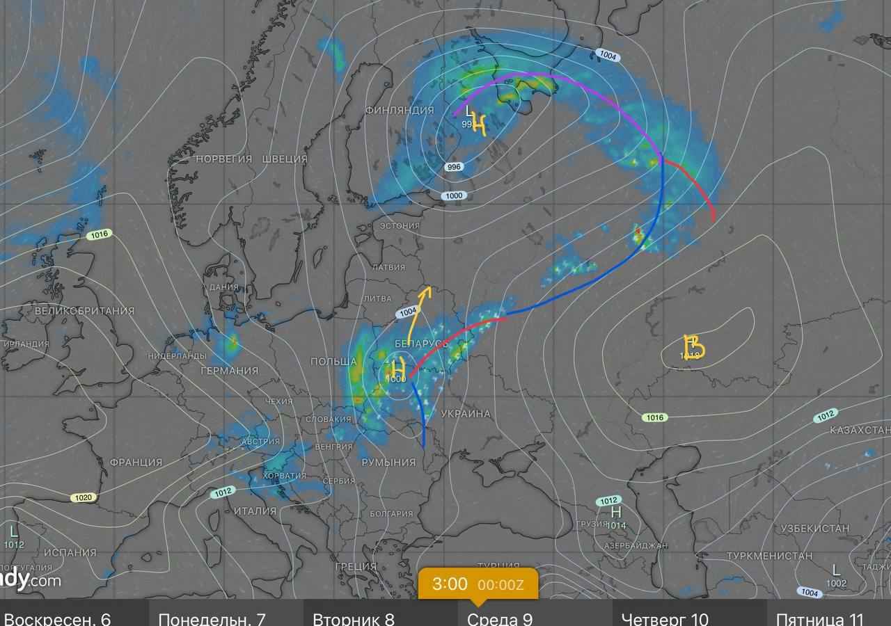 Между тем, начало следующей недели, по словам авторов тематического Telegram-канала о погоде “Метеовайб” выдастся “неспокойным” для многих белорусов. Причиной тому специалисты назвали циклоническую депрессию Фридеманн, центр которой продолжит кружить над Скандинавией.