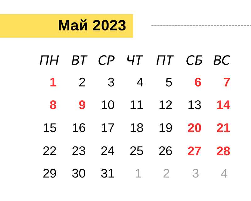 И это все изменения по маю. Дальше — только обычные выходные — воскресенье 14 мая, суббота-воскресенье 20-21 и 27-28 мая.