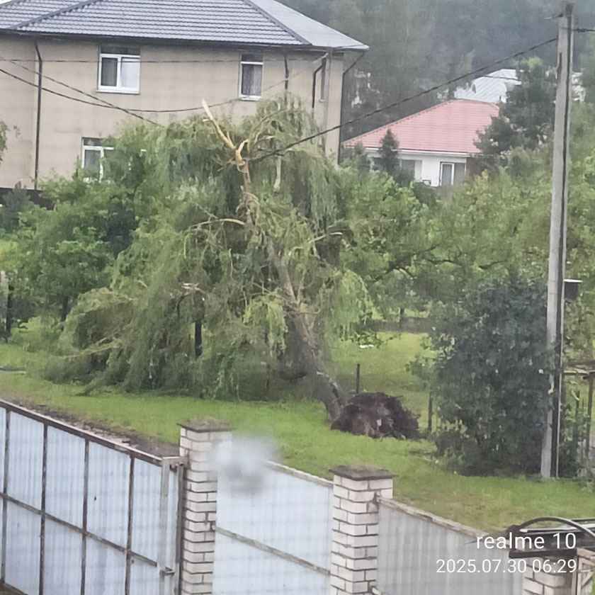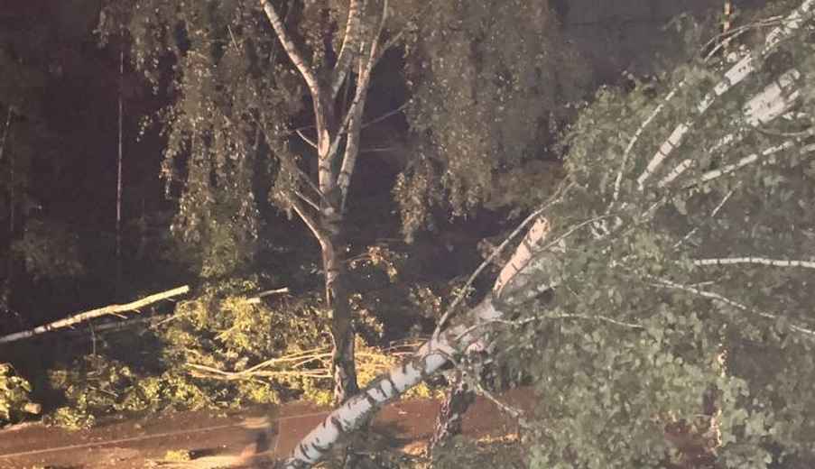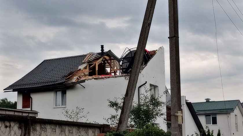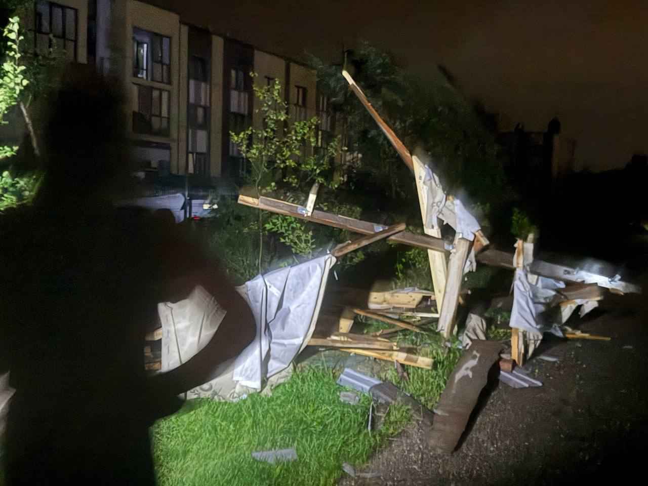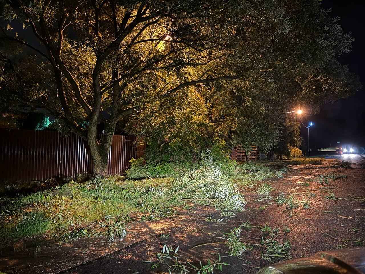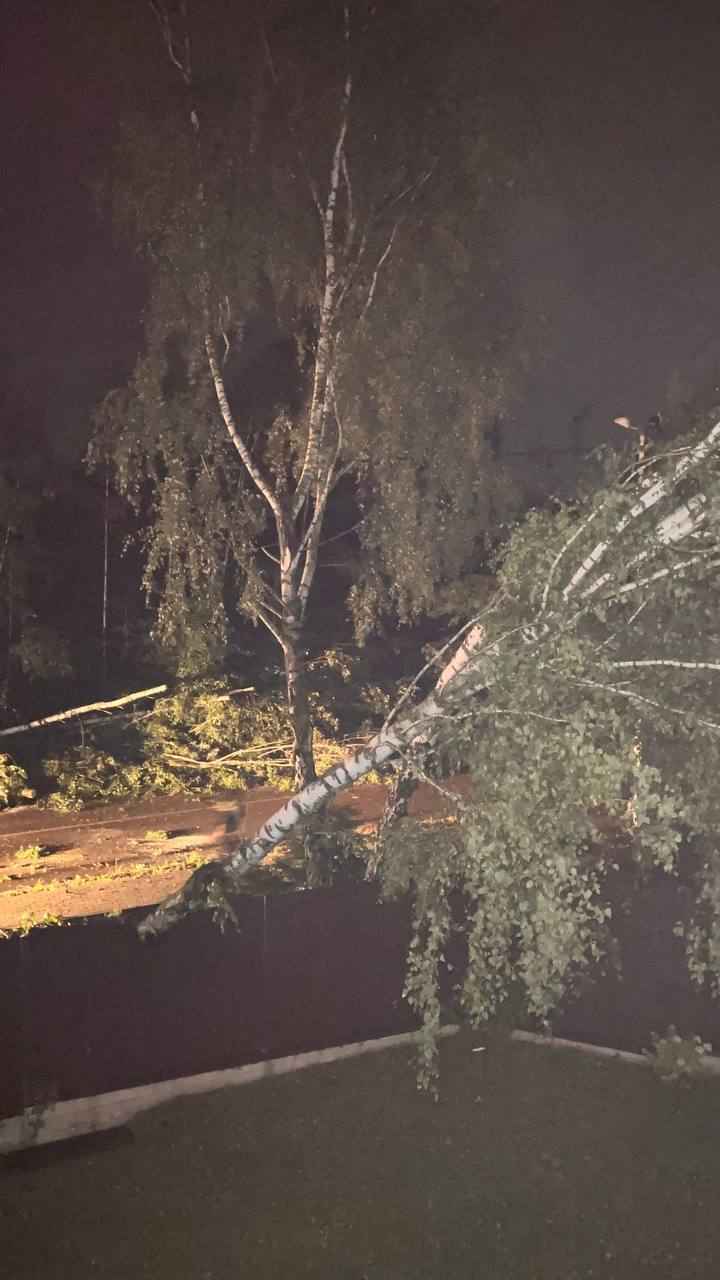 Там в частном секторе ветром повалило несколько деревьев, есть сообщения о пострадавших от них автомобилей. Ветер был такой силы, что сорвал часть крыши на нескольких домах, валил заборы и теплицы и даже перевернул на бок один грузовик. Также, по сообщениям местных жителей, в одном из многоквартирных домов по улице Короткевича в момент грозы выбило окна.