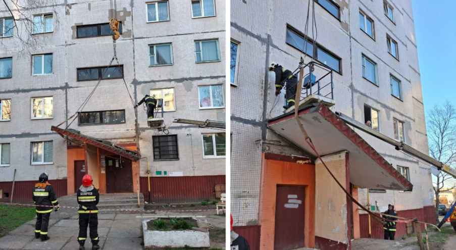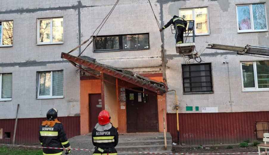 В одной из жилых многоэтажек днём 15 апреля произошло ЧП - железобетонная плита козырька подъезда обрушилась, повиснув на газовой трубе. Подробности происшествия рассказали в Могилевском областном управлении МЧС.