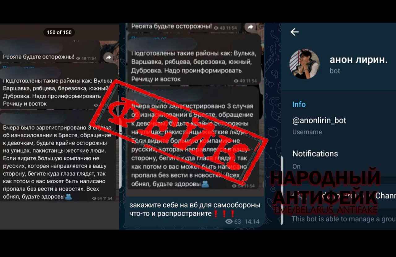 По их данным, «провокаторы через ботов» стали рассылать белорусам личные сообщения о «якобы имевших место трёх случаях изнасилований в Бресте», приписываемых пакистанцам, а также с призывами «быть осторожными на улицах городов» и советами «срочно закупать средства самозащиты».