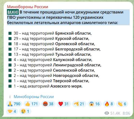 В свою очередь в Министерстве обороны РФ утром 6 июля заявили , что “в течение прошедшей ночи дежурными средствами ПВО уничтожены и перехвачены 120 украинских беспилотных летательных аппаратов самолетного типа” над 10 областями и акваторией моря. Однако Краснодарского края в списке нет.