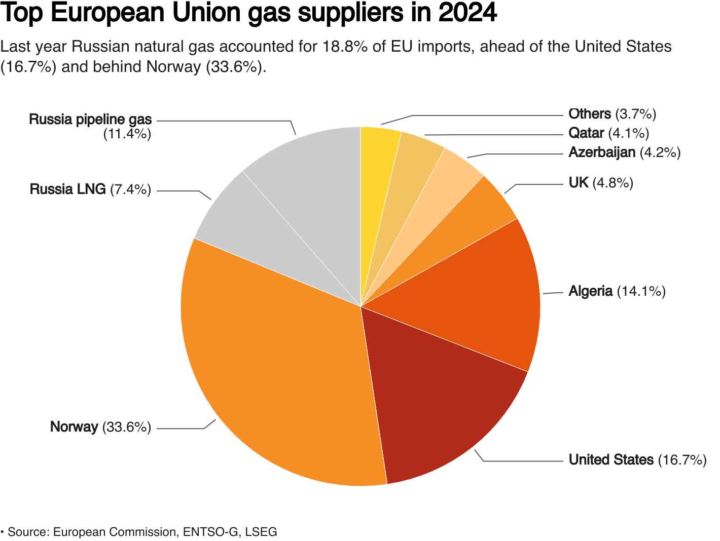 Нынешние торговые войны, по мнению экспертов, усилили опасения по поводу зависимости от американского СПГ. В прошлом году газ из США покрывал 16,7% импорта ЕС, уступая Норвегии (33,6%) и России (18,8%, в основном СПГ от «Новатэк» и остаточные трубопроводные поставки). Ожидается, что доля России упадёт ниже 10% в этом году после прекращения транзита через Украину.