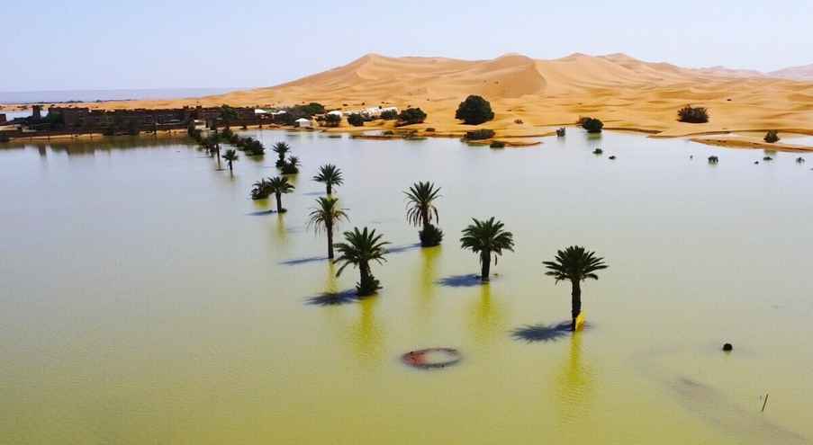 Правительство Марокко заявило, что в сентябре за два дождливых дня осадков выпало больше, чем в среднем за год. Спутники НАСА показали, как вода хлынула в озеро Ирикви, которое было сухим в течение последних 50 лет. В пустынных поселениях, которые часто посещают туристы, внедорожники проезжали по лужам, а жители лишь наблюдали за происходящим, передало международное информагентство Associated Press.