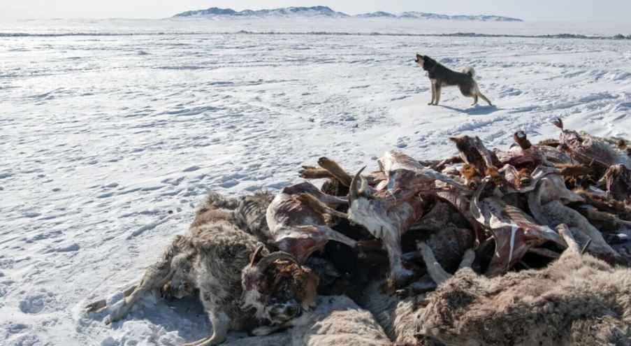 Массовый падёж скота произошел из-за экстремальных погодных условий. Настолько суровую зиму в Монголии последний раз наблюдали 49 лет назад. Столбик термометра этой зимой опустился до -30 градусов по Цельсию, а снег и лед сковали землю и надолго перекрыли доступ к пастбищам для крупного и мелкого рогатого скота. Из-за этого животные начали массово гибнуть. Сейчас потери насчитывают около 4,7 миллионов животных, что существенным образом усугубило продовольственный вопрос для местного населения.