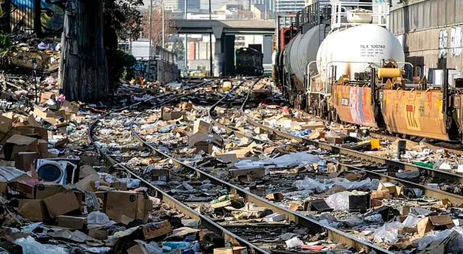 В Интернете уже несколько лет появляются фото и видео, сделанные вдоль железнодорожной линии Юнион Пасифик (Union Pacific) в центре Лос-Анджелеса, где на путях валяются груды разорванных коробок Amazon. В этом городе вошли в моду ограбления поездов.
